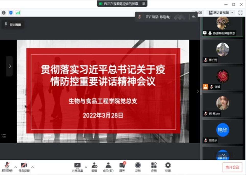 永利官方网站党总支于2022年3月28日晚19:00,以腾讯会议的形式召开了全院大会。由陈迎春副书记传达了关于《402永利集团督导贯彻落实习近平总书记关于疫情防控工作重要讲话精神工作方案》的通知,解读了重点任务督察清单。会上学习了习近平总书记在3月17 日中共中央政治局常务委员会会议上关于疫情防控工作重要讲话精神,同时号召各党支部以“三会一课”和“党日活动”等形式进行进一步的学习和贯彻落实。
