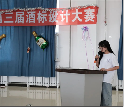 接下来是进行对线上获奖同学的颁奖,线下进入总决赛的十名同学进行酒标设计作品的展示以及意义设计理念的讲述,每位参赛选手在进行理念讲述后由评委老师打分。