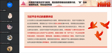 食科2041班团支书向大家介绍了共青团开展党史学习教育的重要性,共青团是党缔造和领导的青年政治组织,“党有号召,团有行动”是百年一贯的优良传统,“党旗所指就是团旗所向”是一切工作的逻辑起点。对照党的部署要求开展全团性集中学习教育,历来是共青团加强自身建设的重要方法。
