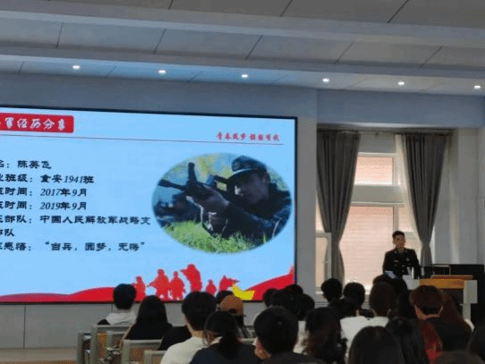 食安1941班的陈英飞同学分享自己参军的经历并简单介绍了自己征兵的过程,并用“充实的”“幸福的”“精彩的”关键词串起了自己的新兵生活,在分享参军感悟时他说:“当兵,圆梦,无悔。”当代青年有幸生在红旗下,长在春风里,受党的教育、沐党的恩情、享党的成就,要矢志为党分忧、为党尽责,做到思想上紧随、政治上忠诚、行动上捍卫,把个人奋斗融入党和国家的事业,尽最大努力为党和人民争取更大光荣。要把责任扛在肩上,把事业放在心上,把忠诚体现到行动上,始终胸怀“国之大者”,以永久奋斗意志、永恒先锋本色做让党放心的忠诚青年,做让人民赞许的热血青年,做党和国家事业需要的有为青年。
