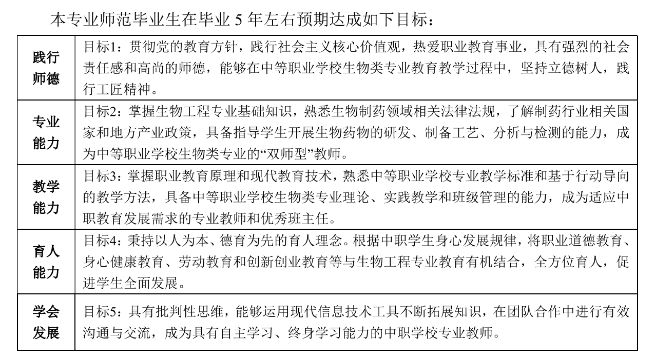 生物工程专业培养目标 来源:培养目标 2024/09/27 生物工程专业培养目标(一)培养目标本专业适应国家和地方中等职业教育发展需求,立足吉林、辐射全国,培养德智体美劳全面发展,系统掌握生物工程专业基础知识和职业教育基本原理和教学方法,具有较强的生物药物研发、生产与分析检测综合实践能力,具有职业教育教学与管理能力、综合育人、终身发展能力,能胜任中等职业学校生物类专业教学和管理工作、并能够在生物类专业教育领域持续创新与发展的“双师型专业教师。(二)目标内涵