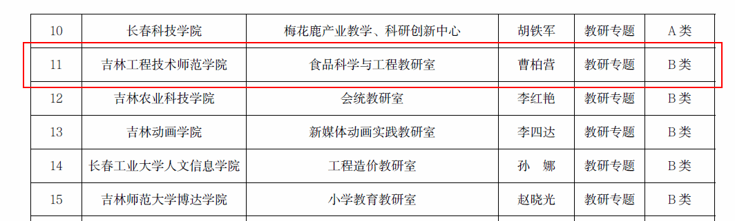 近日,吉林省教育厅下发了《关于公布2022年吉林省普通本科高校优秀基层教学组织名单的通知》(吉教高〔2022〕24号),学校“食品科学与工程教研室”入选2022年吉林省普通本科高校优秀基层教学组织。