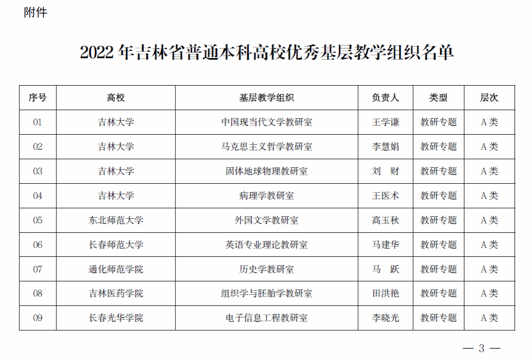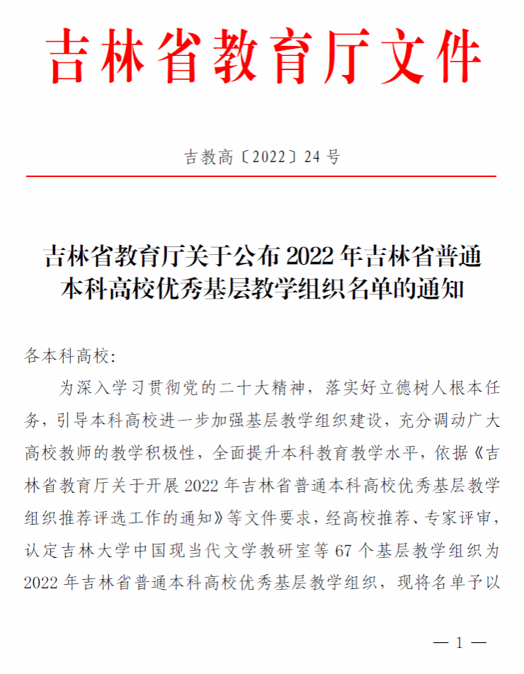 吉林省普通本科高校优秀基层教学组织评选是吉林省教育厅为深入学习贯彻党的二十大精神,落实立德树人根本任务,引导本科高校进一步加强基层教学组织建设,全面提升本科教育教学水平的一项重要举措。本次评选,全省共有67 个基层教学组织被评选为2022 年吉林省普通本科高校优秀基层教学组织。