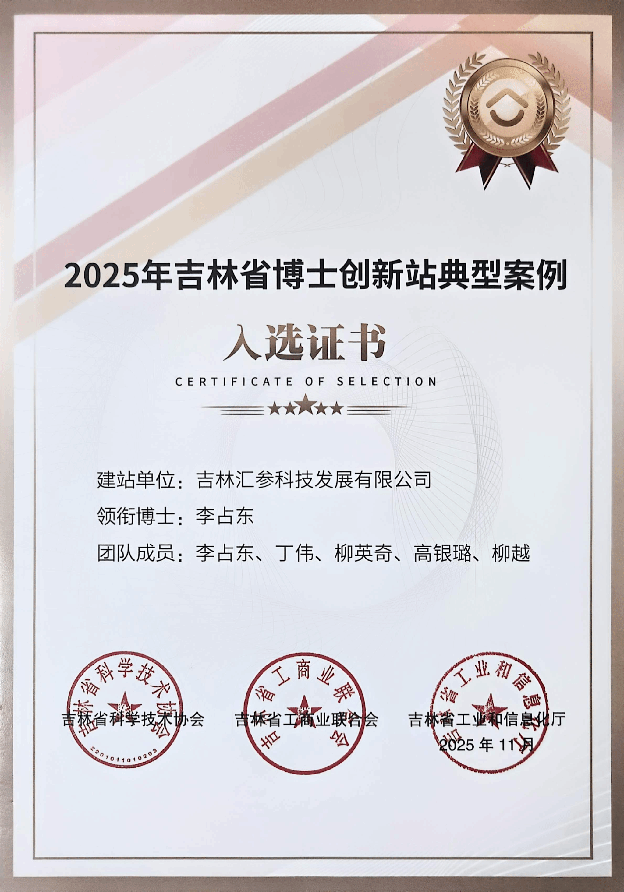 博士创新站建设是服务吉林振兴发展、促进科技与经济紧密结合的一项探索性工作,为科技成果转化和人才成长创造了有利条件。于2025年6月,我院李占东博士及其团队与拟建站单位吉林汇参科技发展有限公司共同参与了由吉林省科学技术协会、吉林省工商业联合会、吉林省工业和信息化厅联合组织开展的2025年吉林省博士创新站建设申报工作。