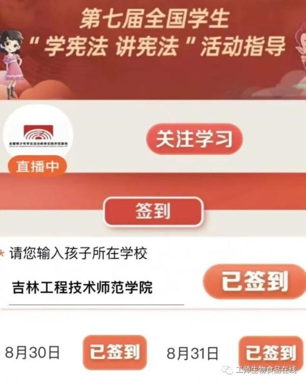 培训会开始前,由各班负责人通知本班学生按要求进行网络签到,并在规定时间内进入直播间观看学习。让同学们提升宪法意识,争做懂法大学生。