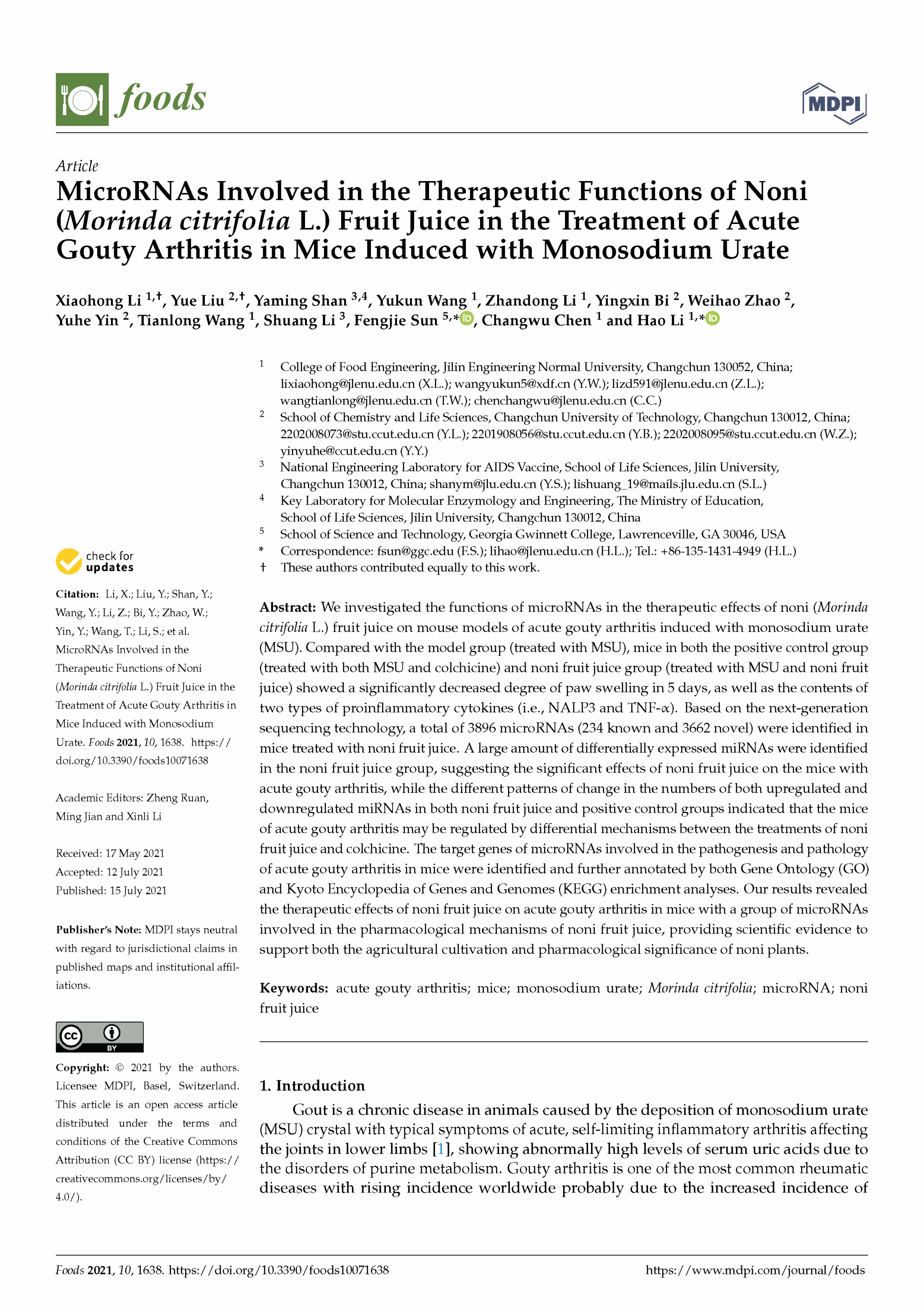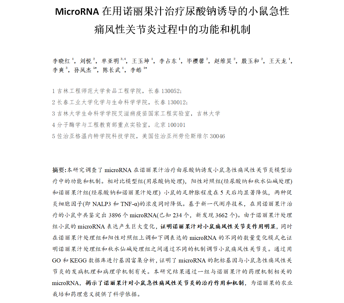 相关研究成果以“MicroRNAs Involved in the Therapeutic Functions of Noni(Morinda citrifolia L.) Fruit Juice in the Treatment of Acute Gouty Arthritis in Mice Induced with Monosodium Urate”为题,于2021年7月15日发表于食品领域国际著名期刊 FOODS。