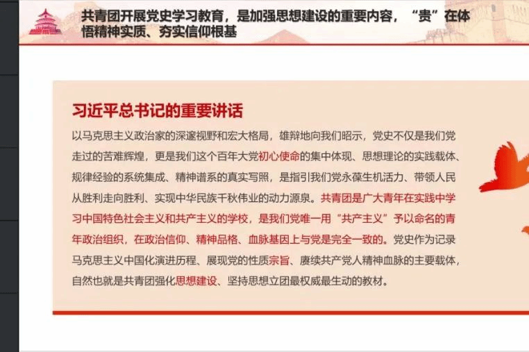 食科2041班团支书向大家介绍了共青团开展党史学习教育的重要性,共青团是党缔造和领导的青年政治组织,“党有号召,团有行动”是百年一贯的优良传统,“党旗所指就是团旗所向”是一切工作的逻辑起点。对照党的部署要求开展全团性集中学习教育,历来是共青团加强自身建设的重要方法。